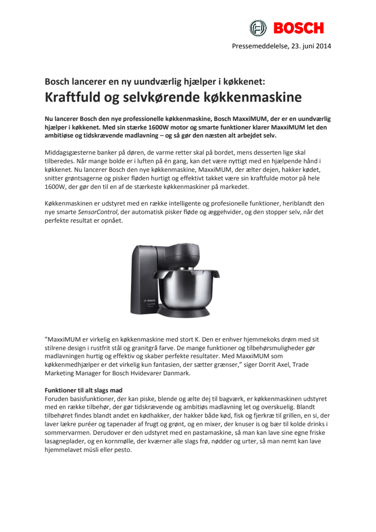 Nu lancerer Bosch den nye professionelle køkkenmaskine, Bosch MaxxiMUM, der er en uundværlig hjælper i køkkenet. Med sin stærke 1600W motor og smarte funktioner klarer MaxxiMUM let den ambitiøse og tidskrævende madlavning – og så gør den næsten alt arbejdet selv.