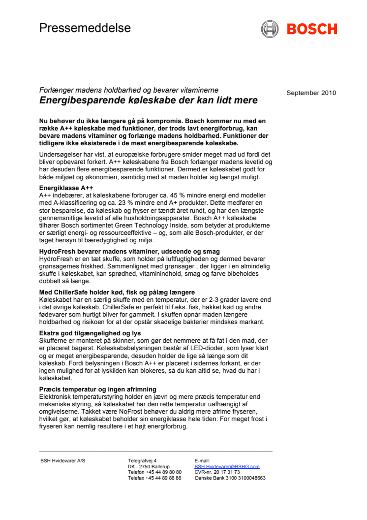 Nu behøver du ikke længere gå på kompromis. Bosch kommer nu med en række A++ køleskabe med funktioner, der trods lavt energiforbrug, kan bevare madens vitaminer og forlænge madens holdbarhed. Funktioner der tidligere ikke eksisterede i de mest energibesparende køleskabe.