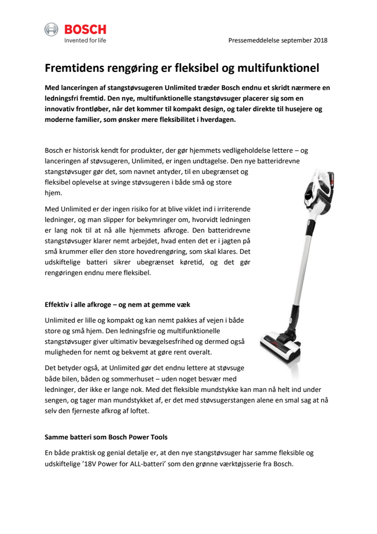 Med lanceringen af stangstøvsugeren Unlimited træder Bosch endnu et skridt nærmere en ledningsfri fremtid. Den nye, multifunktionelle stangstøvsuger placerer sig som en innovativ frontløber, når det kommer til kompakt design, og taler direkte til husejere og moderne familier, som ønsker mere fleksibilitet i hverdagen.