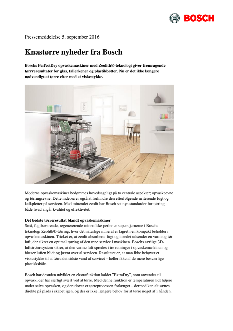 Boschs PerfectDry opvaskemaskiner med Zeolith®-teknologi giver fremragende tørrreresultater for glas, tallerkener og plastikbøtter. Nu er det ikke længere nødvendigt at tørre efter med et viskestykke.