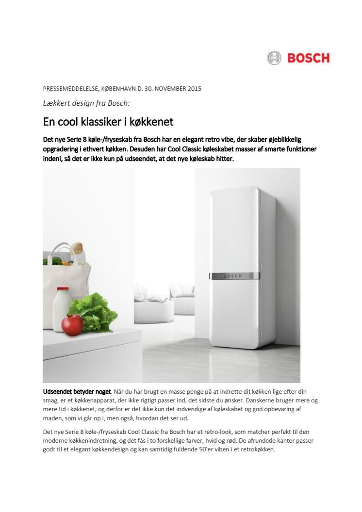 Det nye Serie 8 køle-/fryseskab fra Bosch har en elegant retro vibe, der skaber øjeblikkelig opgradering i ethvert køkken. Desuden har Cool Classic køleskabet masser af smarte funktioner indeni, så det er ikke kun på udseendet, at det nye køleskab hitter.
