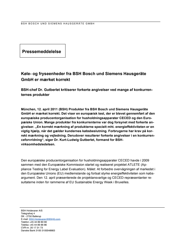 München, 12. april 2011 (BSH) Produkter fra BSH Bosch und Siemens Hausgeräte GmbH er mærket korrekt. Det viser en europæisk test, der er blevet gennemført af den europæiske producentorganisation for husholdningsapparater CECED og den Europæiske Union. Mange produkter fra konkurrenterne var dog forsynet med forkerte angivelser. „En korrekt mærkning af produkterne specielt mht. energieffektiviteten er en vigtig hjælp, når det gælder kundernes købsbeslutning. Forbrugerne har krav på korrekt mærkning og vejledning. Derudover resulterer forkerte angivelser i en konkurrenceforvridning“, siger Dr. Kurt-Ludwig Gutberlet, formand for BSH-virksomhedsledelsen.