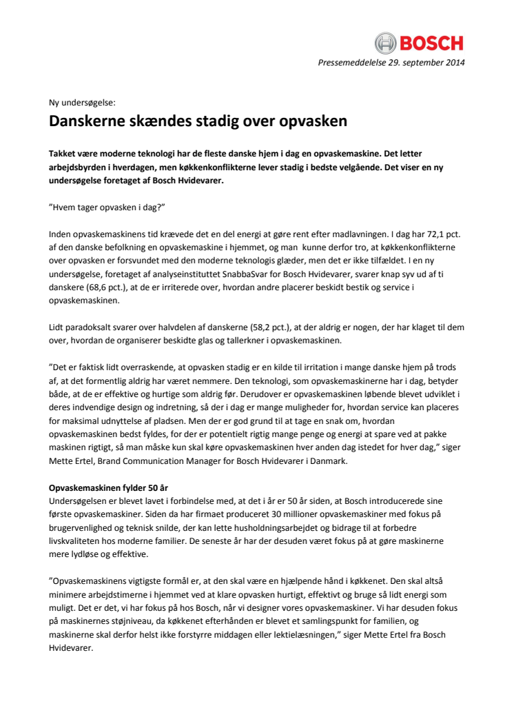 ”Det er faktisk lidt overraskende, at opvasken stadig er en kilde til irritation i mange danske hjem på trods af, at det formentlig aldrig har været nemmere. Den teknologi, som opvaskemaskinerne har i dag, betyder både, at de er effektive og hurtige som aldrig før. Derudover er opvaskemaskinen løbende blevet udviklet i deres indvendige design og indretning, så der i dag er mange muligheder for, hvordan service kan placeres for maksimal udnyttelse af pladsen. Men der er god grund til at tage en snak om, hvordan opvaskemaskinen bedst fyldes, for der er potentielt rigtig mange penge og energi at spare ved at pakke maskinen rigtigt, så man måske kun skal køre opvaskemaskinen hver anden dag istedet for hver dag,” siger Mette Ertel, Brand Communication Manager for Bosch Hvidevarer i Danmark.