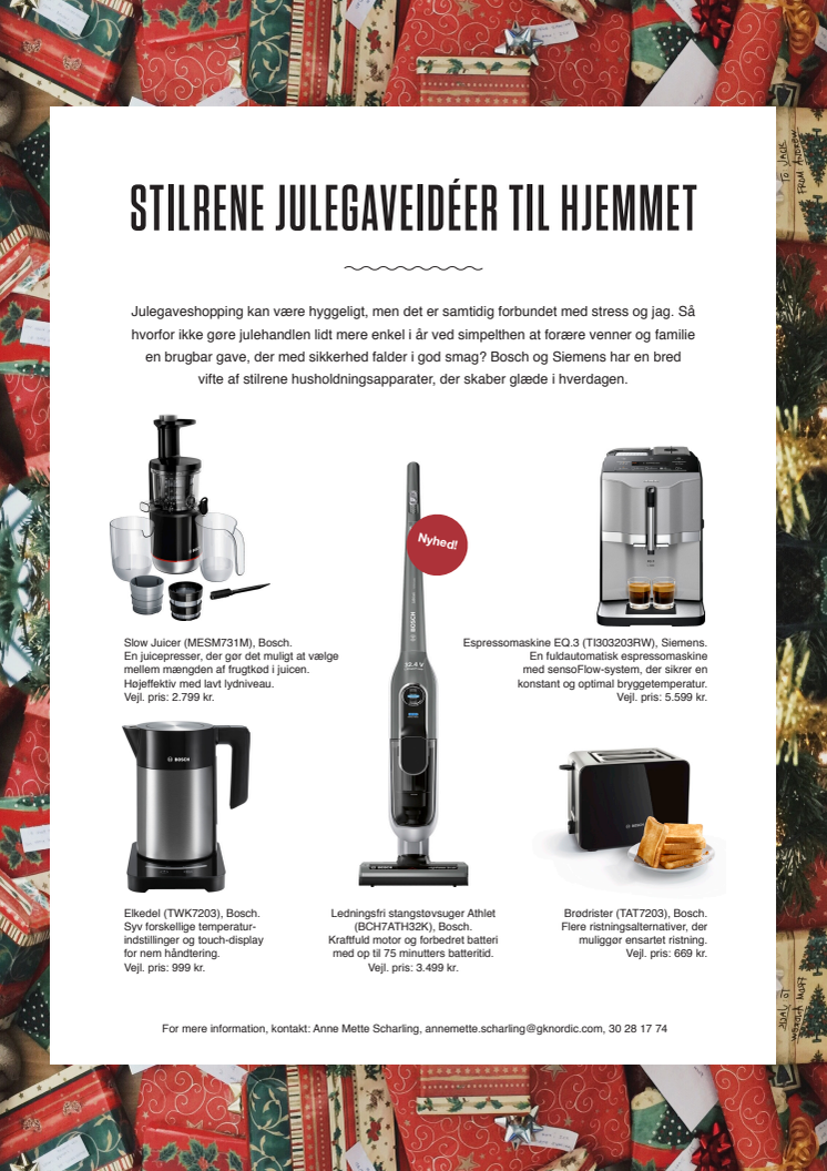 Julegaveshopping kan være hyggeligt, men det er samtidig forbundet med stress og jag. Så hvorfor ikke gøre julehandlen lidt mere enkel i år ved simpelthen at forære venner og familie en brugbar gave, der med sikkerhed falder i god smag? Bosch og Siemens har en bred vifte af stilrene husholdningsapparater, der skaber glæde i hverdagen.