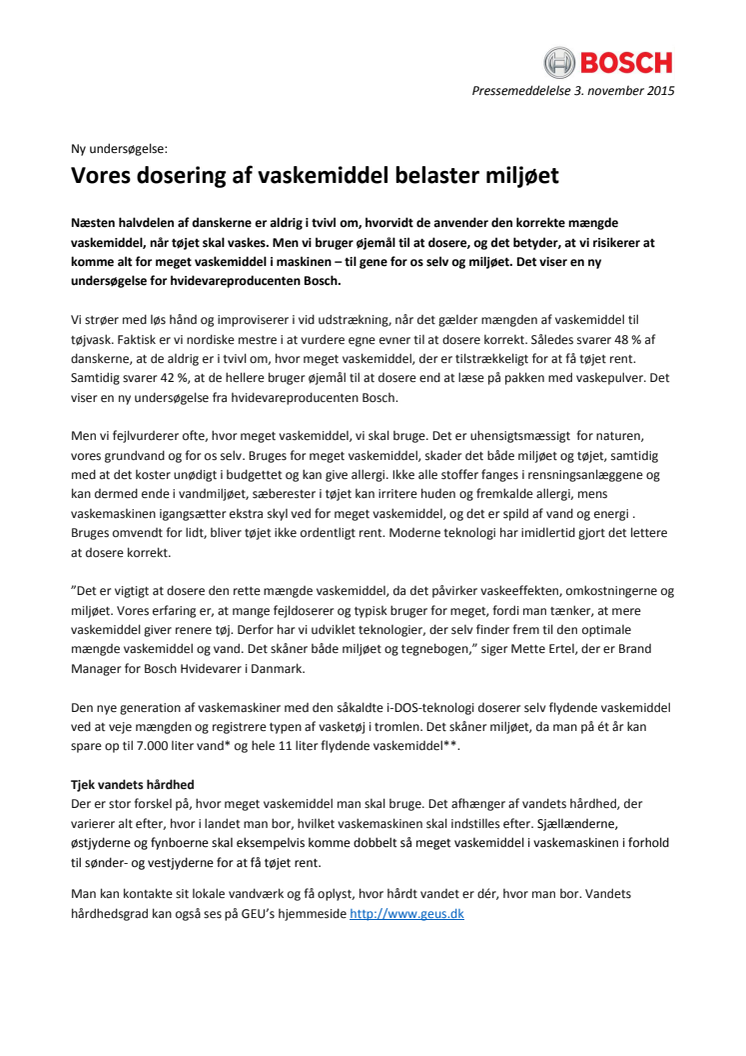 ”Det er vigtigt at dosere den rette mængde vaskemiddel, da det påvirker vaskeeffekten, omkostningerne og miljøet. Vores erfaring er, at mange fejldoserer og typisk bruger for meget, fordi man tænker, at mere vaskemiddel giver renere tøj. Derfor har vi udviklet teknologier, der selv finder frem til den optimale mængde vaskemiddel og vand. Det skåner både miljøet og tegnebogen,” siger Mette Ertel, der er Brand Manager for Bosch Hvidevarer i Danmark.