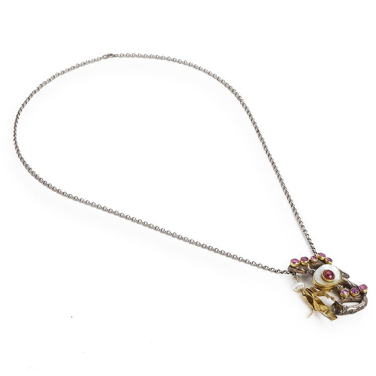 Arje Griegst- Halskæde af sølv med vedhæng af 18 kt. guld og sølv prydet med cabochonslebne turmaliner, perlemor og flodperle.