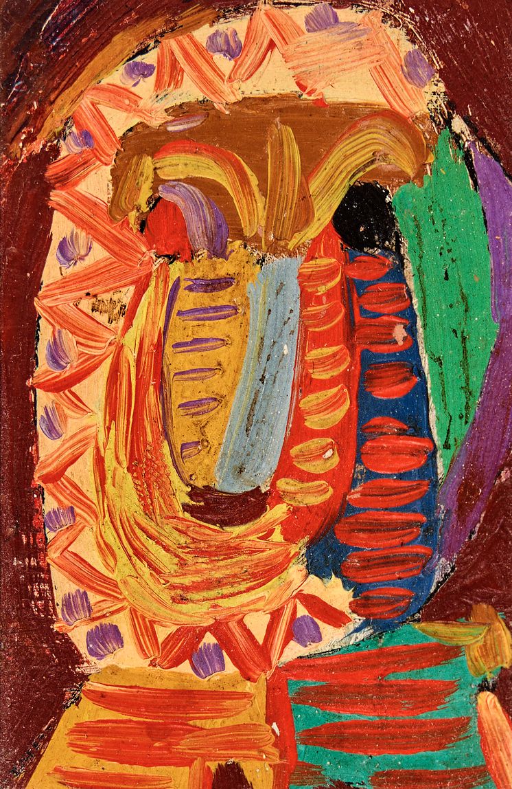 Asger Jorn- Uden titel, ca. 1944-45. Usign. Olie på plade indrammet med krydsfiner. 9 x 6,5. Lysmål 7,5 x 5..jpeg