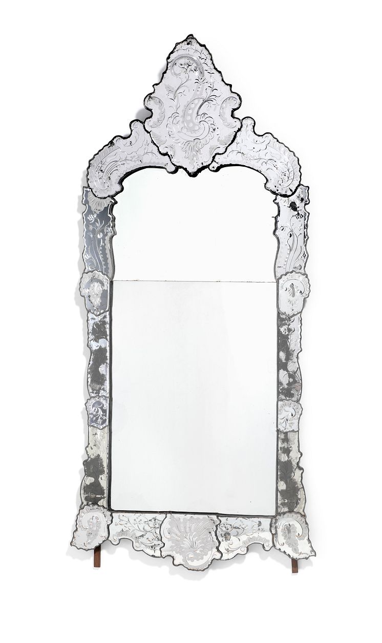 Et par store venetianske rokoko spejle, hver med rammer af slebet blyindfattet spejlglas. Murano, 18. årh.s midte.