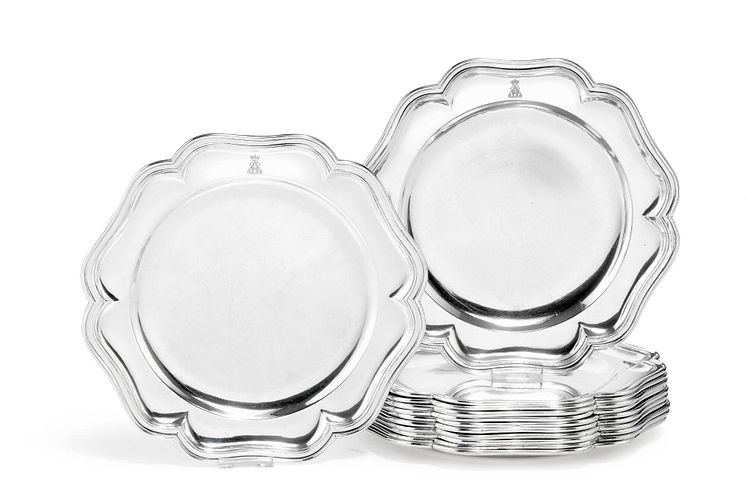 Et sæt på tolv dækketallerkener af sølv, kronet monogram for Prins Christian (X) og Prinsesse Alexandrine. 1898