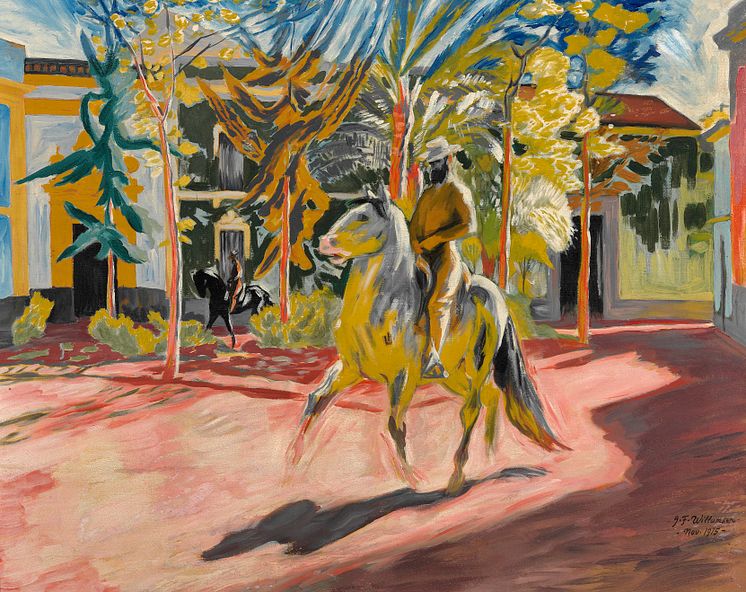 J. F. Willumsen- En rytter i en af Cordobas gader. Sign. J.F. Willumsen nov. 1915. Tempera på lærred. 83 x 105.