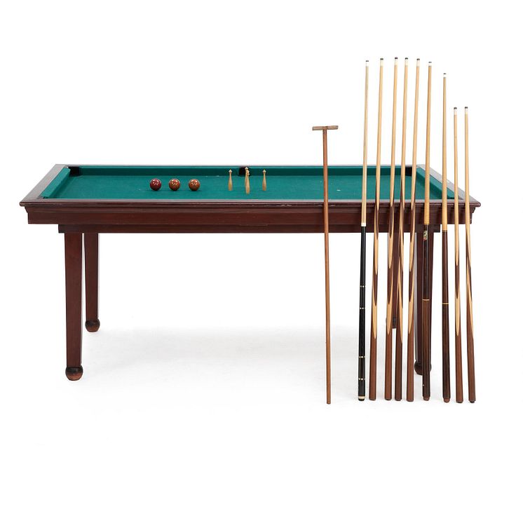 "Kvarter" billardbord med kanter af mahogni. Medfølgende kugler, kegler og køer. 20. årh.s begyndelse