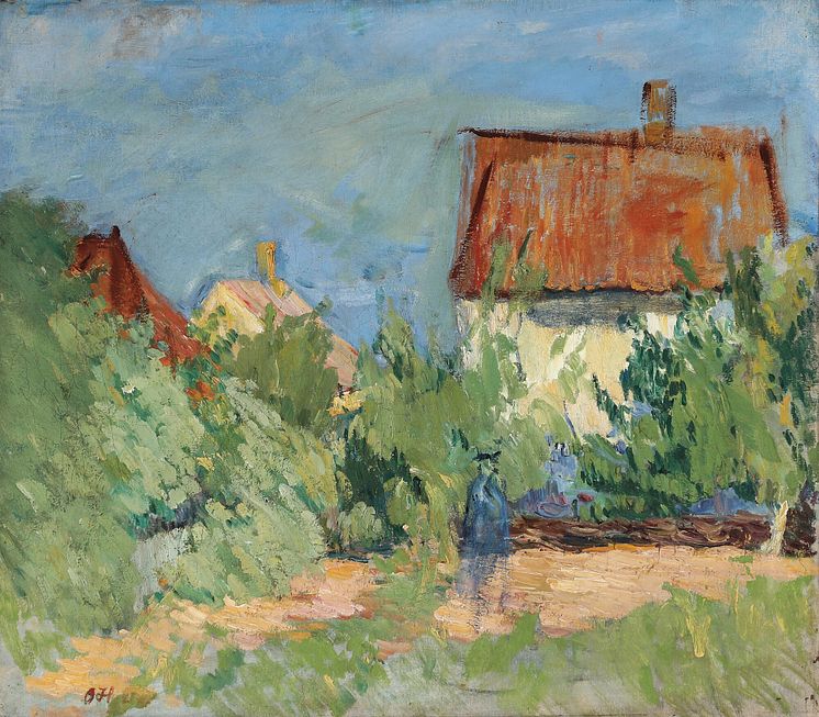 Oluf Høst (f. Svaneke 1884, d. Gudhjem 1966). Sommereftermiddag i kunstnerens have. Sign. OH. Kunsthallen katalog medfølger. Olie på lærred. 63×71. hammerslag 34.000 kr.jpg