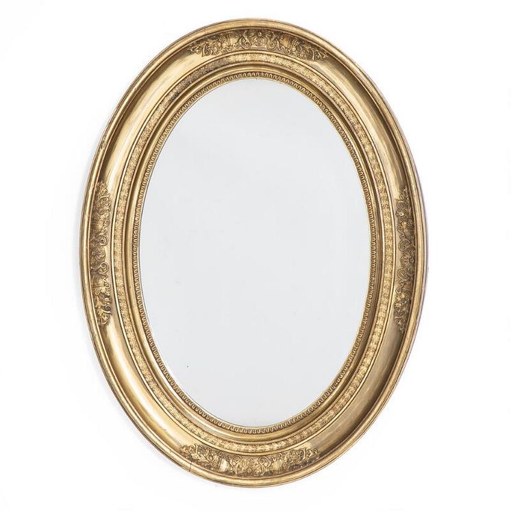 Ovalt dansk senempire spejl i ramme af forgyldt træ og gesso. 1840'erne