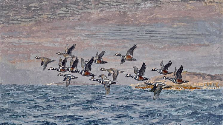 • Johannes Larsen. En flok flyvende strømænder over havet ud for Kangerlussuaq (Søndre Strømfjord), Grønland. Hammerslag 260.000 kr..jpg