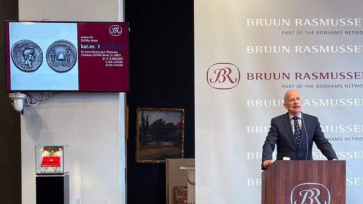 Der lød store klapsalver i salen i Bredgade, da en legendarisk denar fik et hammerslag på intet mindre end 3,4 mio. kr. hos Bruun Rasmussen. Den godt 2000 år gamle denar bar da også på en usædvanlig og dramatisk historie, eftersom det var den denar, som Marcus Junius Brutus fik præget i forbindelse med mordet på den romerske statsmand Julius Cæsar år 44. f.Kr.