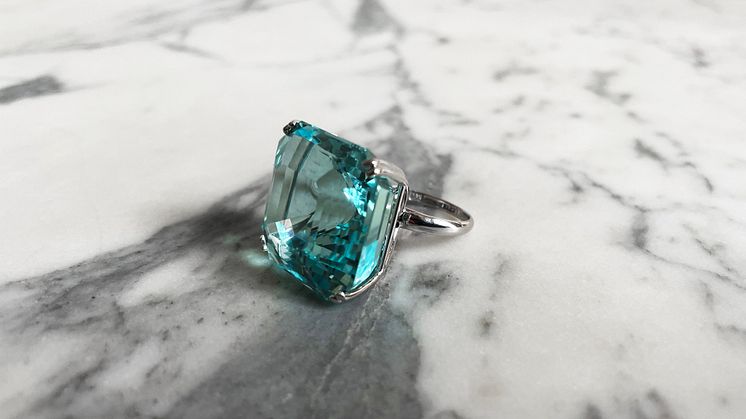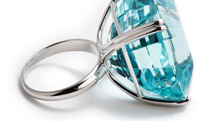 Den smukke akvamarinring er af 18 karat hvidguld og prydet med en facetslebet brasiliansk akvamarin på ca. 53.33 karat og fattet hos kgl. hofjuvelerer A. Dragsted i 1950’erne. Ifølge smykkespecialist hos Bruun Rasmussen, Katrin Mikkelsen Sørensen, er der tale om en usædvanligt stor og flot sten: