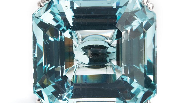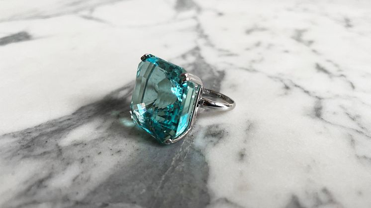 ”Det er en meget elegant cocktailring med en utroligt flot akvamarin – sten som man typisk finder i Brasilien – og fattet hos hofjuveler A. Dragsted. Til den kommende auktion måtte vi have stenen ud af fatningen og veje den, fordi den er så usædvanlig både i farve og størrelse,” fortæller Katrin Mikkelsen Sørensen.