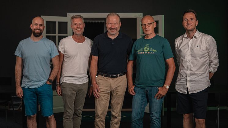Billede 1:Holdet bag cykelpodkasten Souplesse, der sponseres af Bygma. Fra venstre ses vært Sebastian Stanbury, sportsjournalist Jacob Staehelin, tidligere cykelrytter Lars Michaelsen, cykelekspert Per Bausager og vært Adam Møller Gomaa. Fotokredit: Marcus Califano