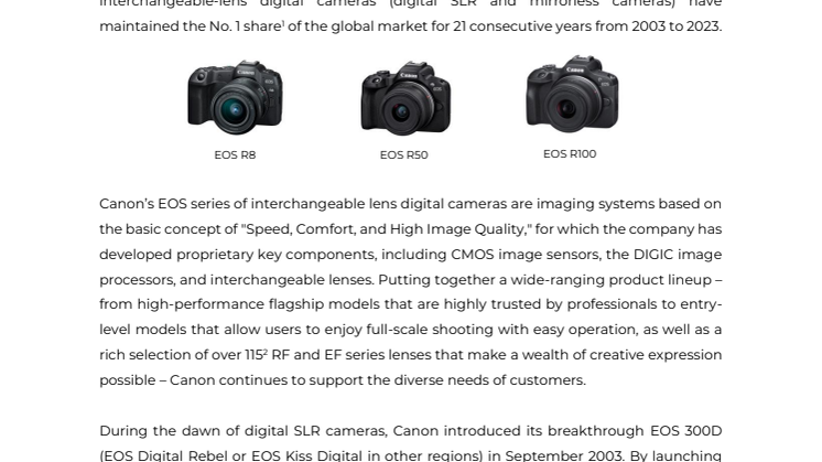 Søborg, Denmark, 20 February 2024– Canon Inc. announced today that the company’s interchangeable-lens digital cameras (digital SLR and mirrorless cameras) have maintained the No. 1 share1of the global market for 21 consecutive years from 2003 to 2023.