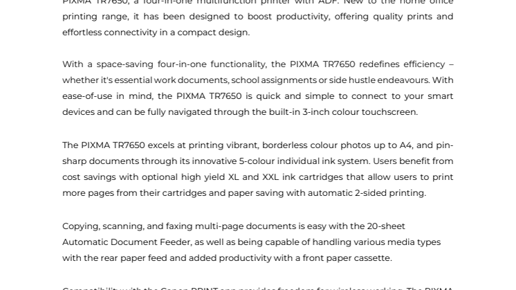 Canon Europe today announces the release of the PIXMA TR7650, a four-in-one multifunction printer with ADF. New to the home office printing range, it has been designed to boost productivity, offering quality prints and effortless connectivity in a compact design.
