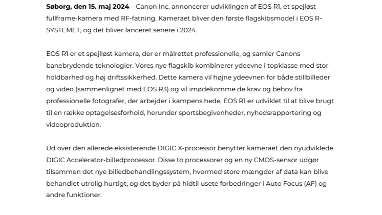 Søborg, den 15. maj 2024 – Canon Inc. annoncerer udviklingen af EOS R1, et spejløst fullframe-kamera med RF-fatning. Kameraet bliver den første flagskibsmodel i EOS R-SYSTEMET, og det bliver lanceret senere i 2024.