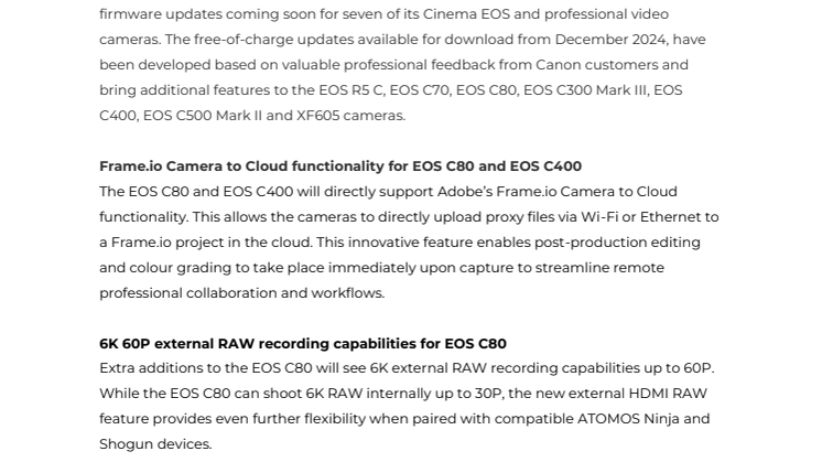 Other firmware updates include lens distortion correction applied during Playback for EOS C70 and compatibility with the latest RF lenses for EOS R5 C, EOS C70, EOS C80 and EOS C400.