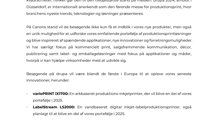 Søborg, Danmark, april 2024 – Canon er tilbage på drupa efter otte års pause, og vi glæder os over at annoncere vores tilbagevenden med en spektakulær stand på 4600 kvadratmeter, hvilket gør den til den tredjestørste stand på messen. drupa 2024, afholdt i Düsseldorf, er internationalt anerkendt som den førende messe for produktionsprint, hvor branchens nyeste trends, teknologier og løsninger præsenteres.