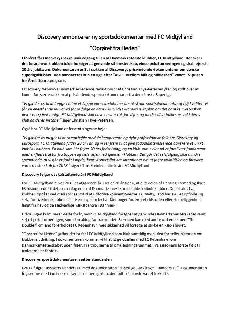Discovery annoncerer ny sportsdokumentar med FC Midtjylland: ”Oprøret fra Heden”