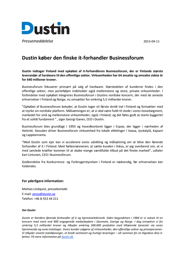 Dustin indtager Finland med opkøbet af it-forhandleren Businessforum, der er Finlands største leverandør af hardware til den offentlige sektor. Virksomheden har 64 ansatte og omsatte sidste år for 640 millioner kroner.
