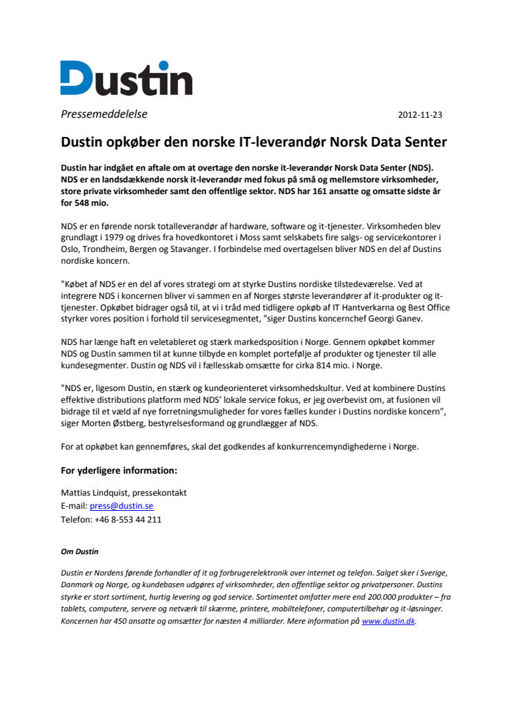 Dustin har indgået en aftale om at overtage den norske it-leverandør Norsk Data Senter (NDS). NDS er en landsdækkende norsk it-leverandør med fokus på små og mellemstore virksomheder, store private virksomheder samt den offentlige sektor. NDS har 161 ansatte og omsatte sidste år for 548 mio.