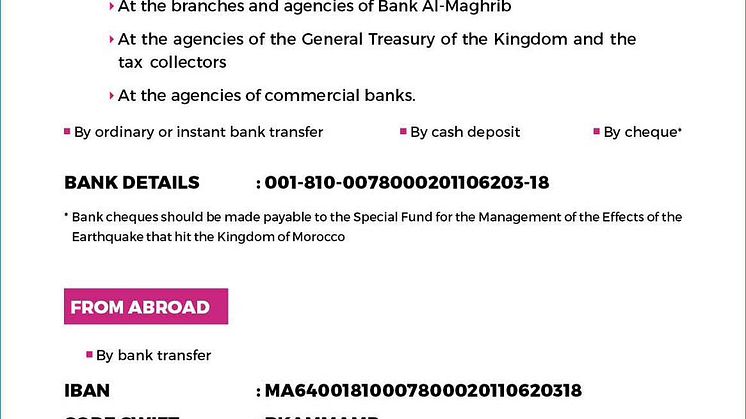 In accordance with the High Instructions of His Majesty the King, may god assist Him, a special bank account has been opened at Bank Al Maghrib to receive voluntary solidarity contribution.