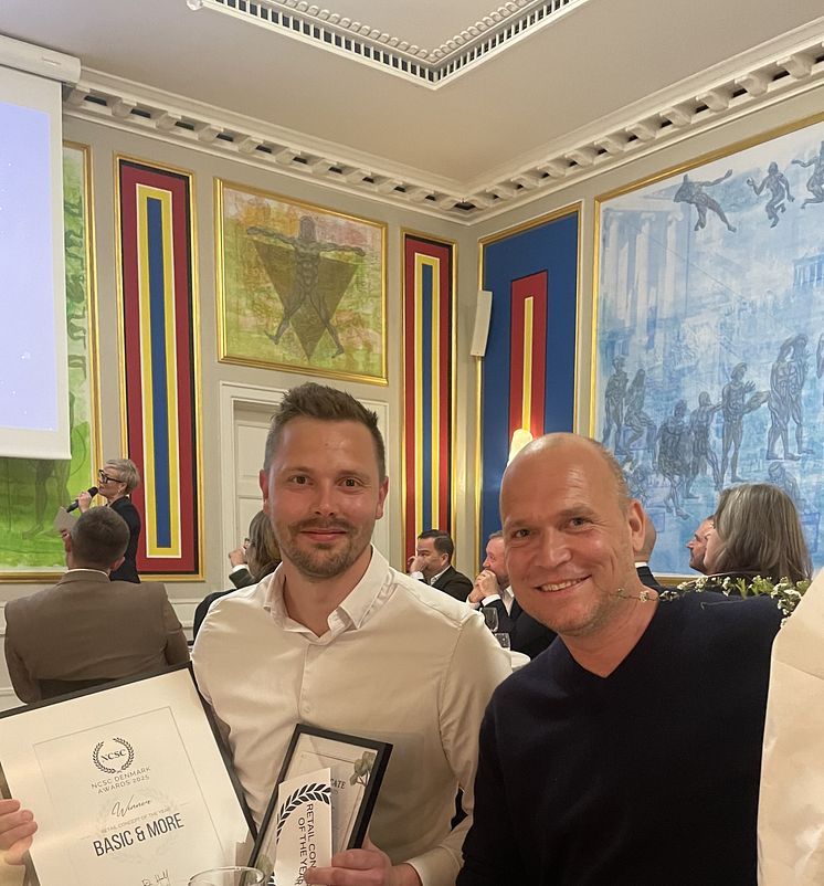 Basic & More er kåret som årets bedste detailkoncept ved NCSC Denmark. Prisen blev modtaget af driftsdirektør Jeppe Stounbjerg (tv.) og udviklingsdirektør Rasmus Rask. Foto: Basic & More.