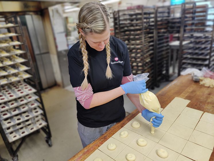 Ifølge konditor Anette Drengsgaard er der ikke noget så kedeligt som en fastelavnsbolle med for lidt fyld – så vær gavmild med crememassen. Foto: PR.