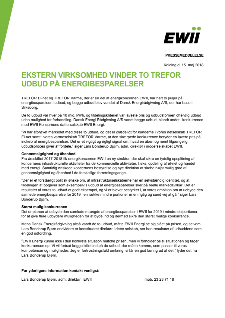 TREFOR El-net og TREFOR Varme, der er en del af energikoncernen EWII, har haft to puljer på energibesparelser i udbud, og begge udbud blev vundet af Dansk Energirådgivning A/S, der har base i Silkeborg.