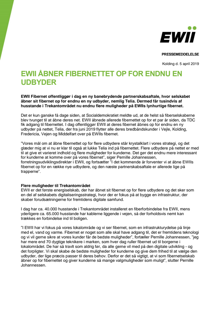 EWII Fibernet offentliggør i dag en ny banebrydende partnerskabsaftale, hvor selskabet åbner sit fibernet op for endnu en ny udbyder, nemlig Telia. Dermed får tusindvis af husstande i Trekantområdet nu endnu flere muligheder på EWIIs lynhurtige fibernet.