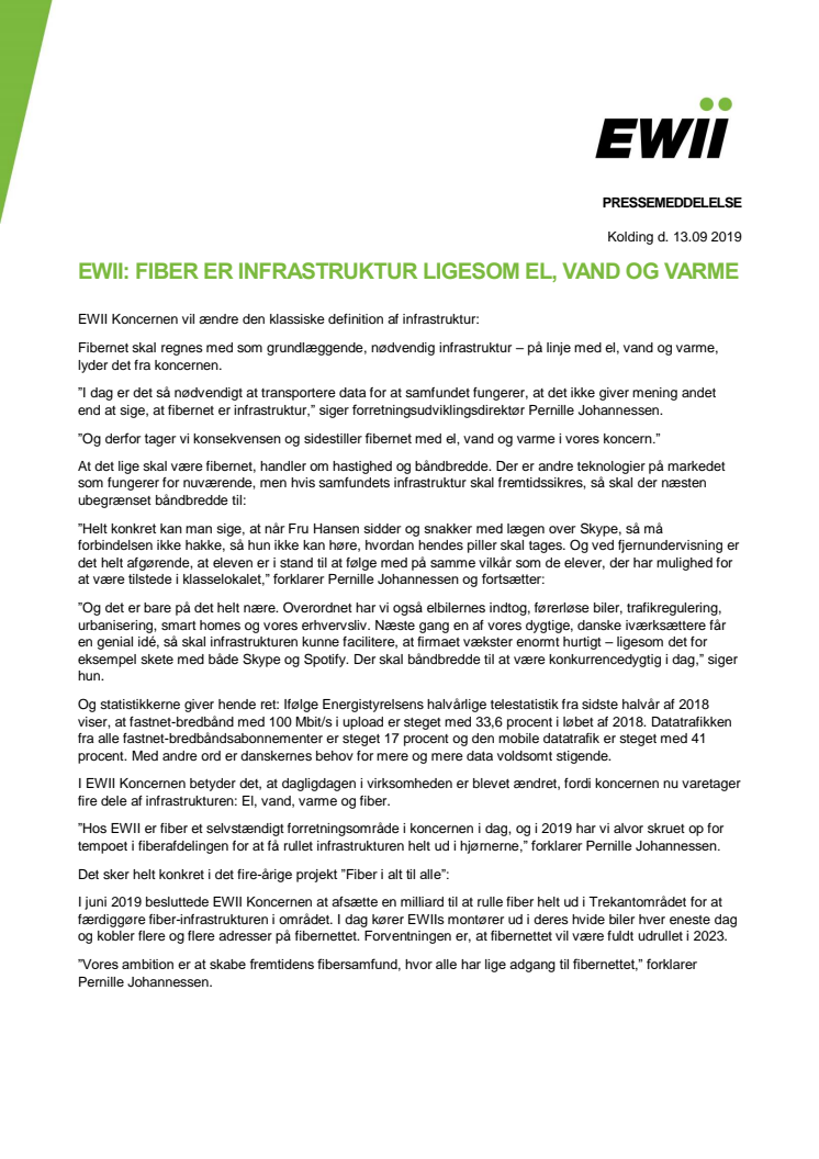 Fibernet skal regnes med som infrastruktur – på linje med el, vand og varme, lyder det fra EWII Koncernen.