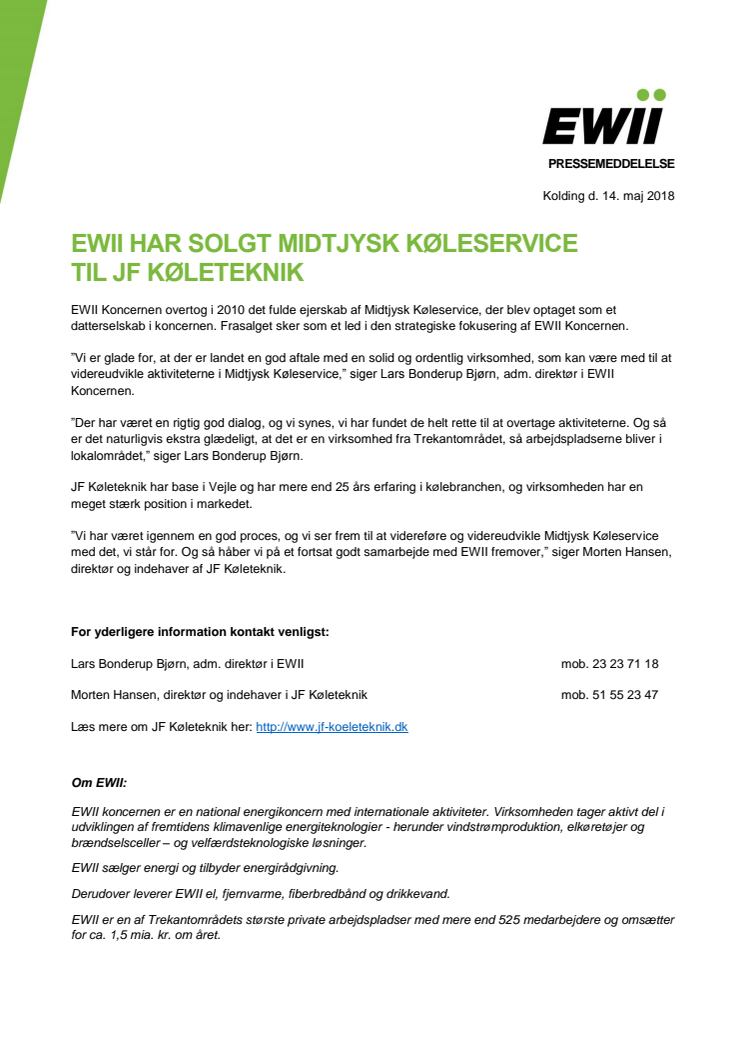 EWII har solgt Midtjysk Køleservice til JF Køleteknik
