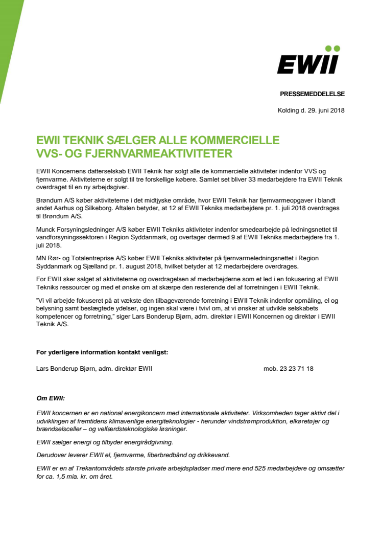 EWII Koncernens datterselskab EWII Teknik har solgt alle de kommercielle aktiviteter indenfor VVS og fjernvarme. Aktiviteterne er solgt til tre forskellige købere. Samlet set bliver 33 medarbejdere fra EWII Teknik overdraget til en ny arbejdsgiver.