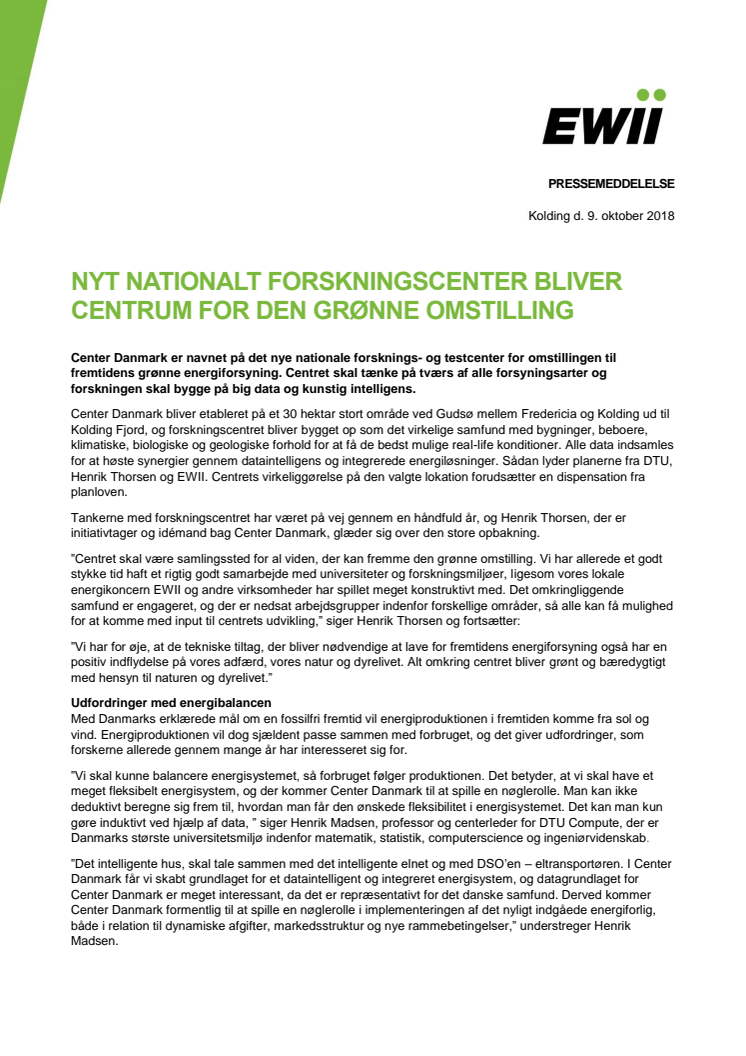 Center Danmark er navnet på det nye nationale forsknings- og testcenter for omstillingen til fremtidens grønne energiforsyning. Centret skal tænke på tværs af alle forsyningsarter og forskningen skal bygge på big data og kunstig intelligens.