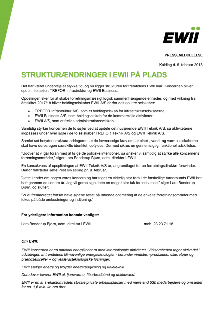 Det har været undervejs et stykke tid, og nu ligger strukturen for fremtidens EWII klar. Koncernen bliver op delt i to søjler: TREFOR Infrastruktur og EWII Business.