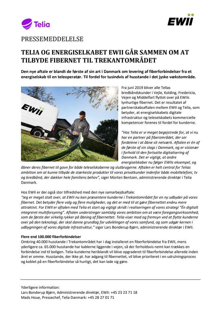 Den nye aftale er blandt de første af sin art i Danmark om levering af fiberforbindelser fra et energiselskab til en teleoperatør. Til fordel for tusindvis af husstande i det jyske vækstområde. Fra juni 2019 bliver alle Telias bredbåndskunder i Vejle, Kolding, Fredericia, Vejen og Middelfart flyttet over på EWIIs lynhurtige fibernet.