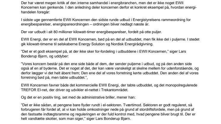 ”Det er et godt eksempel på, at der ikke sker for-fordeling i udbuddene i EWII Koncernen,” siger Lars Bonderup Bjørn, og uddyber: