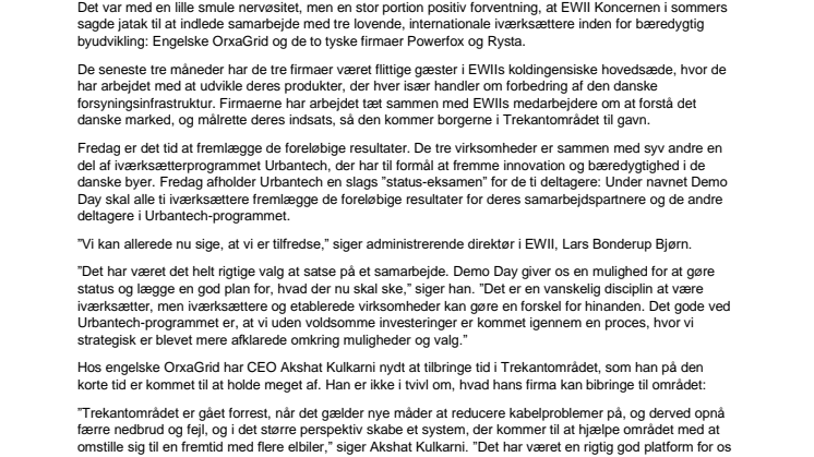 De seneste tre måneder har de tre firmaer været flittige gæster i EWIIs koldingensiske hovedsæde, hvor de har arbejdet med at udvikle deres produkter, der hver især handler om forbedring af den danske forsyningsinfrastruktur. Firmaerne har arbejdet tæt sammen med EWIIs medarbejdere om at forstå det danske marked, og målrette deres indsats, så den kommer borgerne i Trekantområdet til gavn.