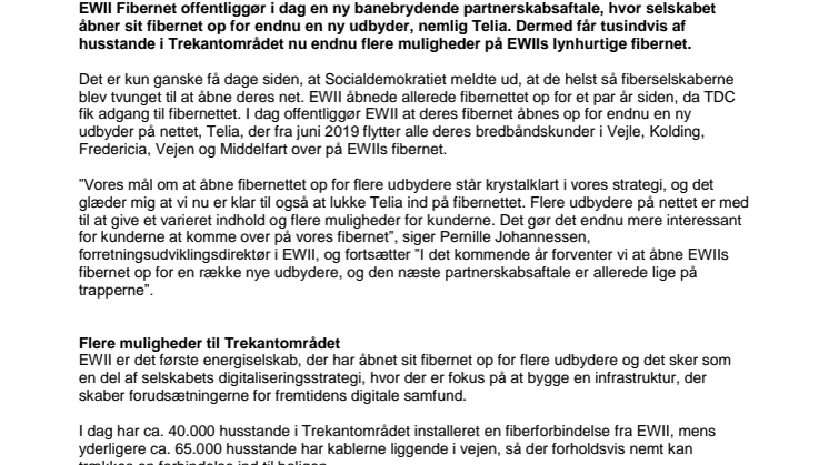 EWII Fibernet offentliggør i dag en ny banebrydende partnerskabsaftale, hvor selskabet åbner sit fibernet op for endnu en ny udbyder, nemlig Telia. Dermed får tusindvis af husstande i Trekantområdet nu endnu flere muligheder på EWIIs lynhurtige fibernet.