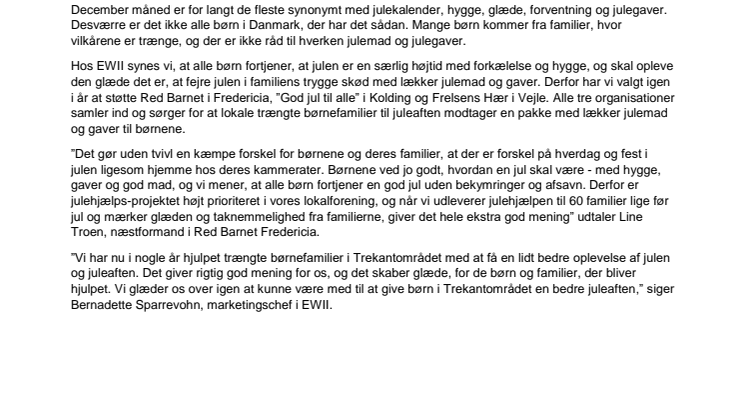 Hos EWII synes vi, at alle børn fortjener, at julen er en særlig højtid med forkælelse og hygge, og skal opleve den glæde det er, at fejre julen i familiens trygge skød med lækker julemad og gaver. Derfor har vi valgt igen i år at støtte Red Barnet i Fredericia, ”God jul til alle” i Kolding og Frelsens Hær i Vejle. Alle tre organisationer samler ind og sørger for at lokale trængte børnefamilier til juleaften modtager en pakke med lækker julemad og gaver til børnene.