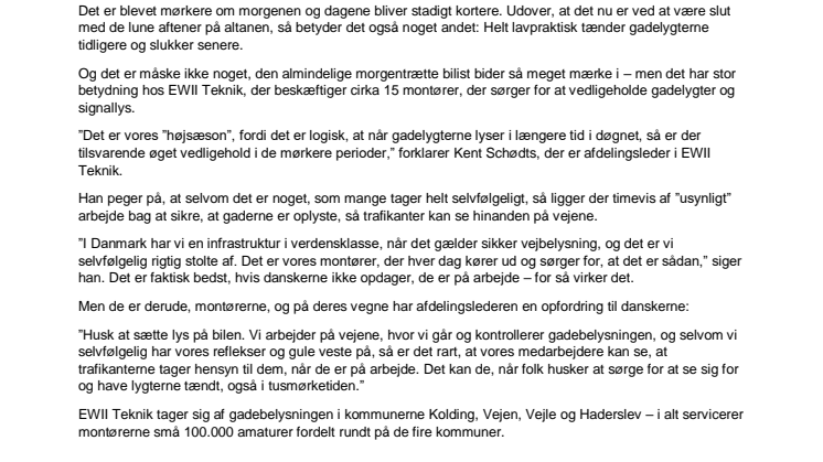 Og det er måske ikke noget, den almindelige morgentrætte bilist bider så meget mærke i – men det har stor betydning hos EWII Teknik, der beskæftiger cirka 15 montører, der sørger for at vedligeholde gadelygter og signallys.