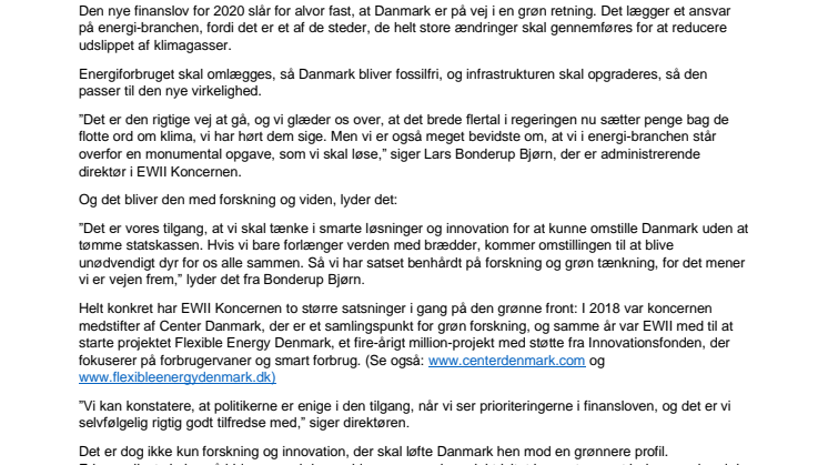 ”Det er den rigtige vej at gå, og vi glæder os over, at det brede flertal i regeringen nu sætter penge bag de flotte ord om klima, vi har hørt dem sige. Men vi er også meget bevidste om, at vi i energi-branchen står overfor en monumental opgave, som vi skal løse,” siger Lars Bonderup Bjørn, der er administrerende direktør i EWII Koncernen.
