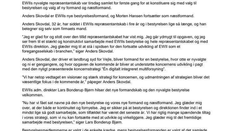 ”Jeg er glad for og stolt over den tillid repræsentantskabet har vist mig. Jeg går ydmygt til opgaven, og jeg ser frem til et stærkt og konstruktivt samarbejde med EWIIs bestyrelse og hele repræsentantskabet og med EWIIs direktion. Jeg glæder mig til at stå i spidsen for den fortsatte udvikling af EWII som et foregangsselskab i branchen,” siger Anders Skovdal.