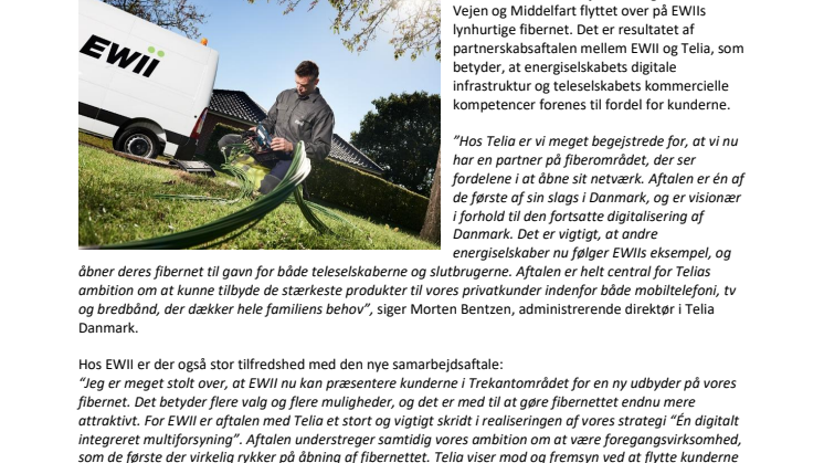 ”Hos Telia er vi meget begejstrede for, at vi nu har en partner på fiberområdet, der ser fordelene i at åbne sit netværk. Aftalen er én af de første af sin slags i Danmark, og er visionær i forhold til den fortsatte digitalisering af Danmark. Det er vigtigt, at andre energiselskaber nu følger EWIIs eksempel, og åbner deres fibernet til gavn for både teleselskaberne og slutbrugerne. Aftalen er helt central for Telias ambition om at kunne tilbyde de stærkeste produkter til vores privatkunder indenfor både mobiltelefoni, tv og bredbånd, der dækker hele familiens behov”, siger Morten Bentzen, administrerende direktør i Telia Danmark.