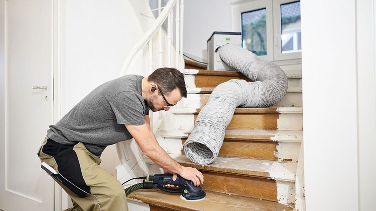 For at forhindre, at støv og snavs ender uden for arbejdsområdet, er det nødvendigt med en støvvæg i kombination med en luftrenser. Der dannes så et undertryk, som målrettet leder støvet ud af rummet og dermed forbedrer luftkvaliteten på arbejdspladsen. Det har også den store fordel, at støvet ikke kommer ind i de omkringliggende rum. Festool har udviklet luftrenseren, så den nemt kan bygges ind i en støvvæg. Ønsker du at samle støvet på et bestemt tidspunkt, er der en seks meter lang, fleksibel slange (tilbehør), der kan lægges direkte ved støvkilden. Det reducerer spredningen af støv i rummet markant. Ved at samle støvet punkt for punkt på denne måde, er det også muligt at beskytte svært tilgængelige steder eller små rum mod støv.